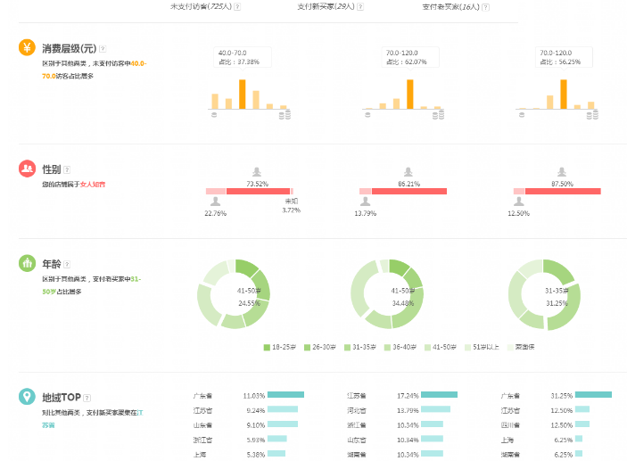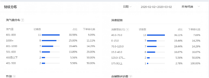 如上图所示:这个店铺的主要进店人群的消费层级以40-70元的人群居多。那么这个店铺的主推款产品是在40-70元之间的客单价,那么这个人群就是精准的,反之,假设产品客单价在120元那么这个店铺的人群就会很不精准,从而导致店铺进店人群的转化率会很低。所以看这里就可以基本判断出你店铺的人群是否足够精准。