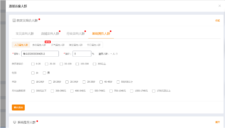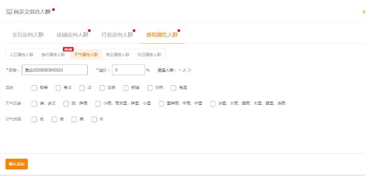 如上图所示,你可以自行去选择你的宝贝要投放在哪一类的人群中间,其中的维度有类目笔单价、性别、年龄、月均消费额度根据你店铺的流量访客分析里面的数据去自行选择你店铺最精准的人群。后面还有包括身份属性人群,天气属性人群,淘宝节日属性人群,还有节日属性人群,都可以根据你自身的特性去进行选择,比如你是卖吃的,你就不考虑天气属性了,但是假如你是卖空气净化器的,你在空气很好的城市那销量肯定就会很惨淡,你是卖羽绒服的,你选择炎热高温天气,那肯定就是和自己的钱包过不去了。前面的宝贝定向人群,店铺定向人群同样以店铺宝贝数据为基础去选择合适的人群,假如不确定这个人群对自己店铺有没有用,就先溢价20%,观察2-3天看看效果,成本不会很高。