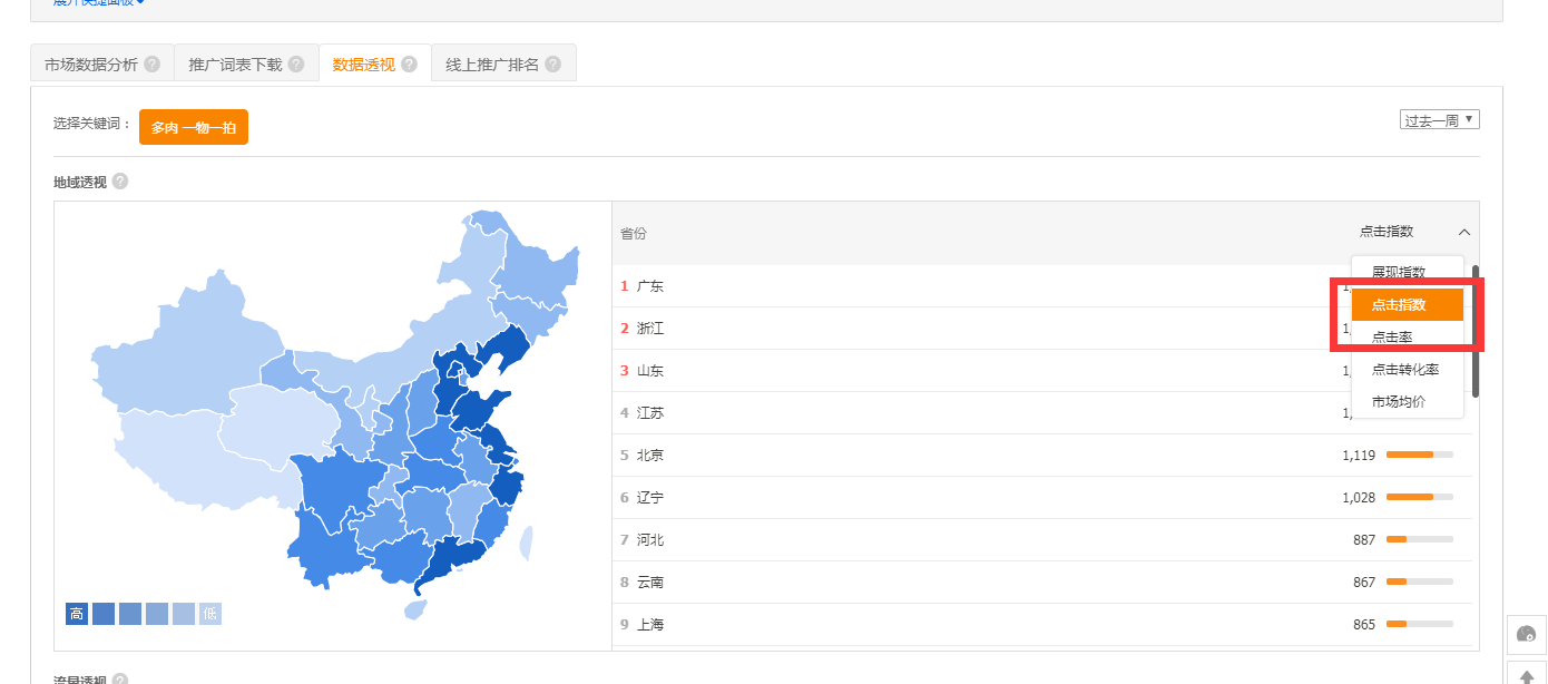 5. 地域筛选出优质关键词的共同高点击指数和高点击率的共同地域5—10个。